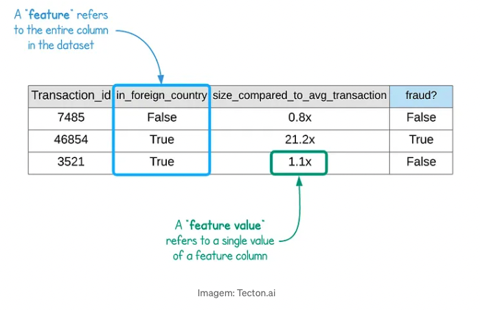 Por exemplo, se uma empresa de cartão de crédito está tentando prever se uma transação é fraudulenta ou não, uma feature útil poderia ser se a transação foi feita em um país no exterior, ou como o valor dessa transação se compara com outras compras do cliente. Quando nos referimos a uma feature, geralmente estamos nos referindo ao conceito desse sinal (exemplo: transação_em_pais_do_exterior), não a um valor específico da feature (exemplo: transação nº 1364 foi em um país estrangeiro).