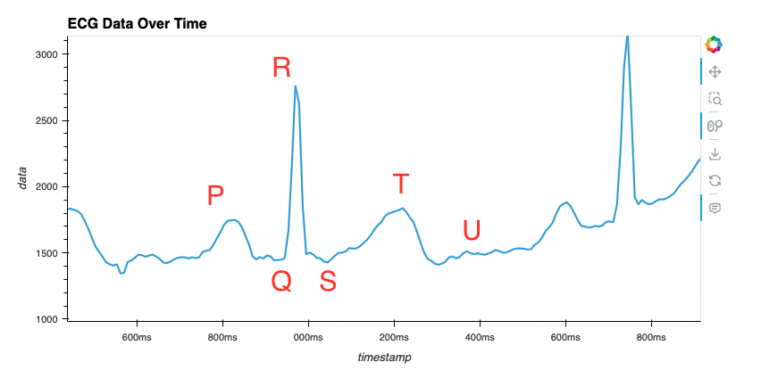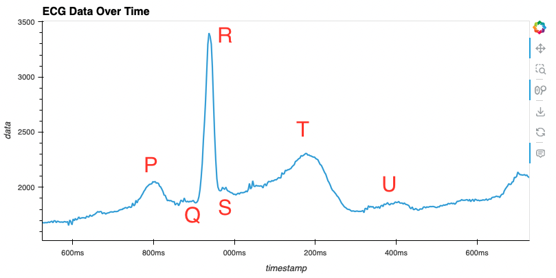 ecg_data.hvplot(x='timestamp', y='data', title='ECG Data Over Time', width=800, height=400)Interpretação do ECG